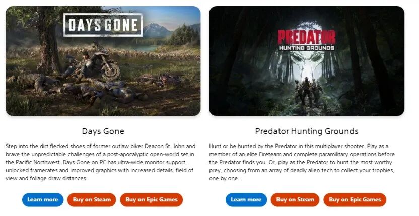 在专区列表中,可以看到《战神》、《地平线:零之曙光》、《往日不再》、《铁血战士:狩猎场》、《地狱潜者》5款游戏的介绍。