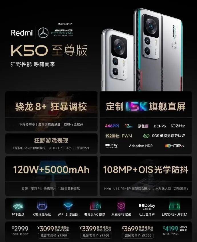 红米K50至尊版搭载骁龙8+芯片,拥有一块1.5K定制直屏以及120W+5000mAh的续航组合、1亿像素光学防抖。对了,这还是纯正的梅赛德斯-奔驰F1车队联名款。