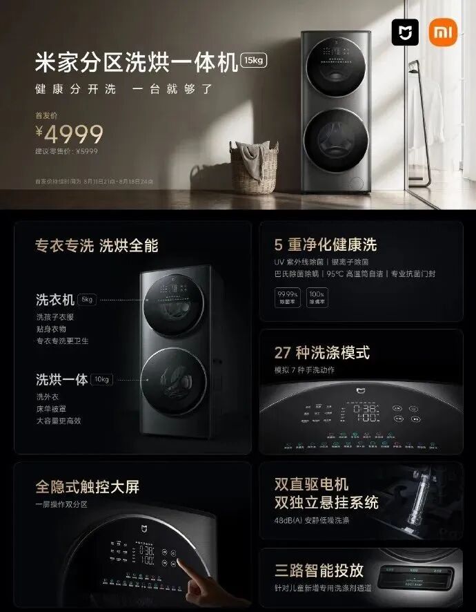 比如,在智能家居领域持续细化深耕,给用户带来了4999元的米家分区洗烘一体机;