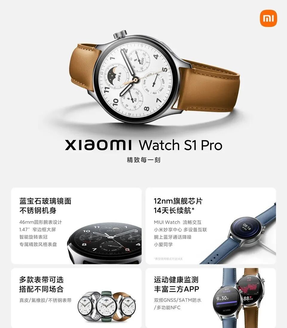 小米Watch S1 Pro采用蓝宝石玻璃镜面+不锈钢机身,搭载一颗12nm芯片,拥有4天超长续航和更为丰富的健康全天深度监测功能,还提供了更多的三方 APP支持。
