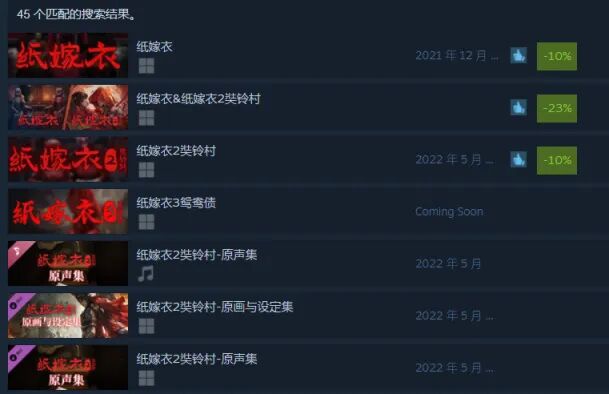 《纸嫁衣》是一款由HeartBeat开发的冒险解谜游戏,手游发布于2021年1月22日,于2021年12月3日在steam发售,售价18元。游戏以国风灵异的画风,在剧情的推送下,找到失踪的诡异新娘。
