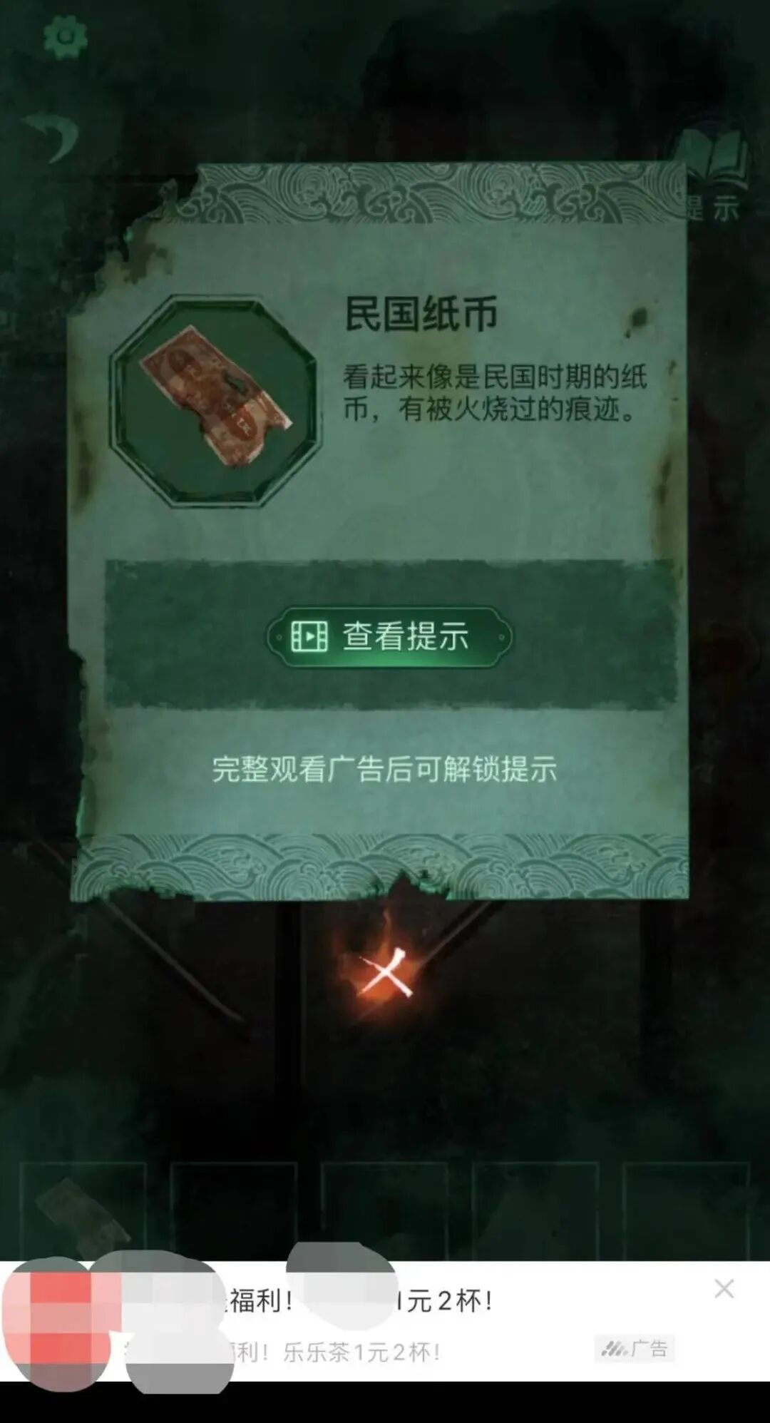 就是遇到解不开的谜题或者不知道使用方法的道具,需要看广告,可能是由于宣发成本的上升,这部需要提示的地方感觉要更多。