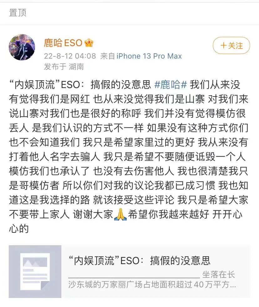 这件事发生之后,作为当事人之一的ESO鹿哈也第一时间进行了回应,表示并没有觉得自己是网红在山寨别人,更没有打着别人的名字去骗人。