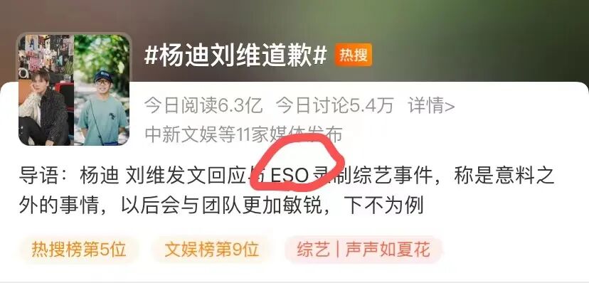 并对被伤害到的朋友表示道歉,要求节目组剪掉ESO的画面。