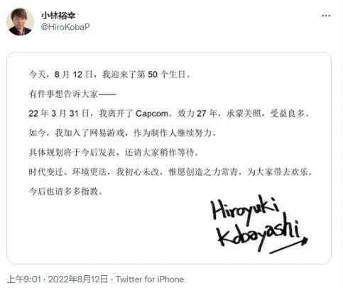 前两天,在卡普空工作了27年的游戏制作人小林裕幸突然在个人推特上宣布,已经在3月底离职,现在加入了网易游戏担任游戏制作人,继续为游戏发光发热。