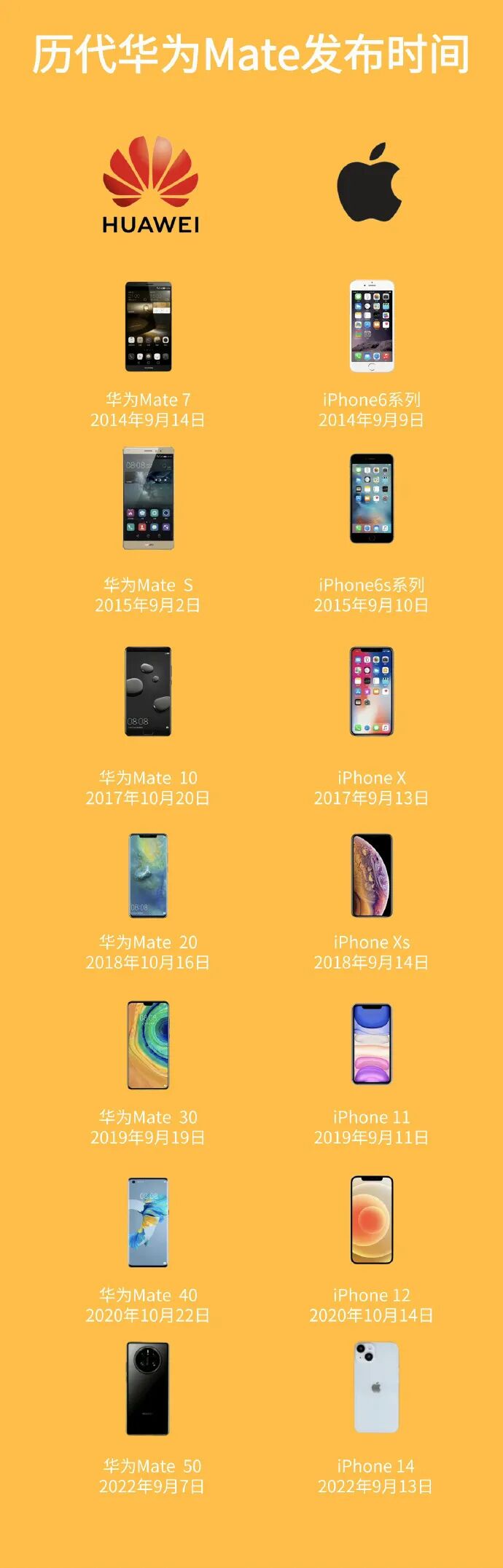 有消息称,原定于9月13日发布的iPhone 14或将提前至9月6日发布,而时隔两年回归的华为Mate 50系列将于9月7号发布。