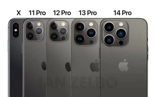 有海外博主制作了一份iPhone X、iPhone 11 Pro-iPhone 14 Pro 后置相机模组的演变对比图。