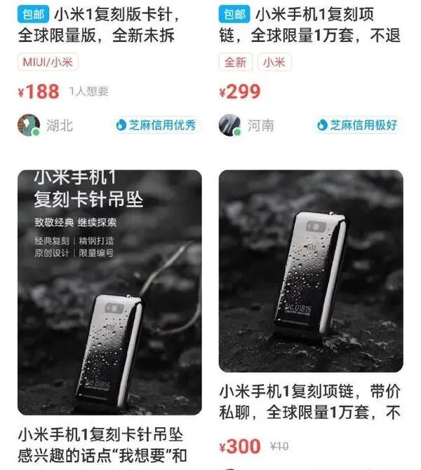 这不,在二手交易平台上,就出现了大量的小米手机1复刻卡针吊坠。