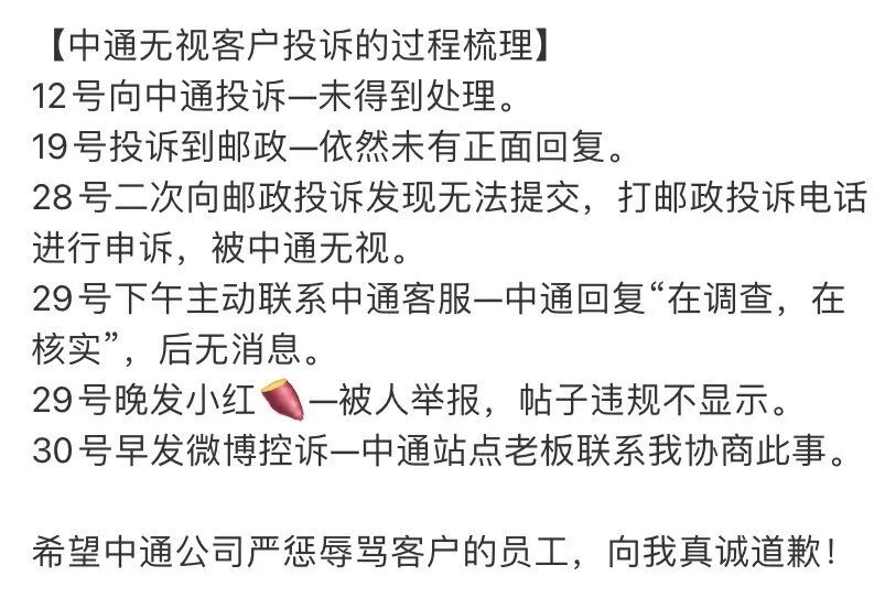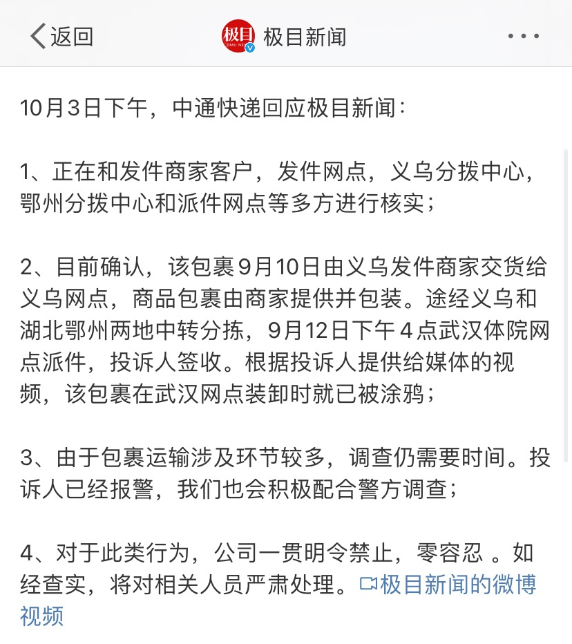 截至目前,中通快递只回应了事情还在核实,以及调查还需时间,别的并没有多说,也没有对小张进行道歉。