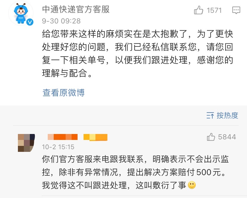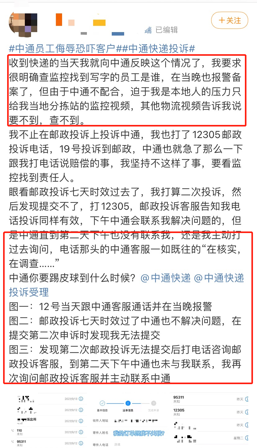 但是可以看得出来,小张在和中通快递进行沟通处理此事的过程并不是很顺利。