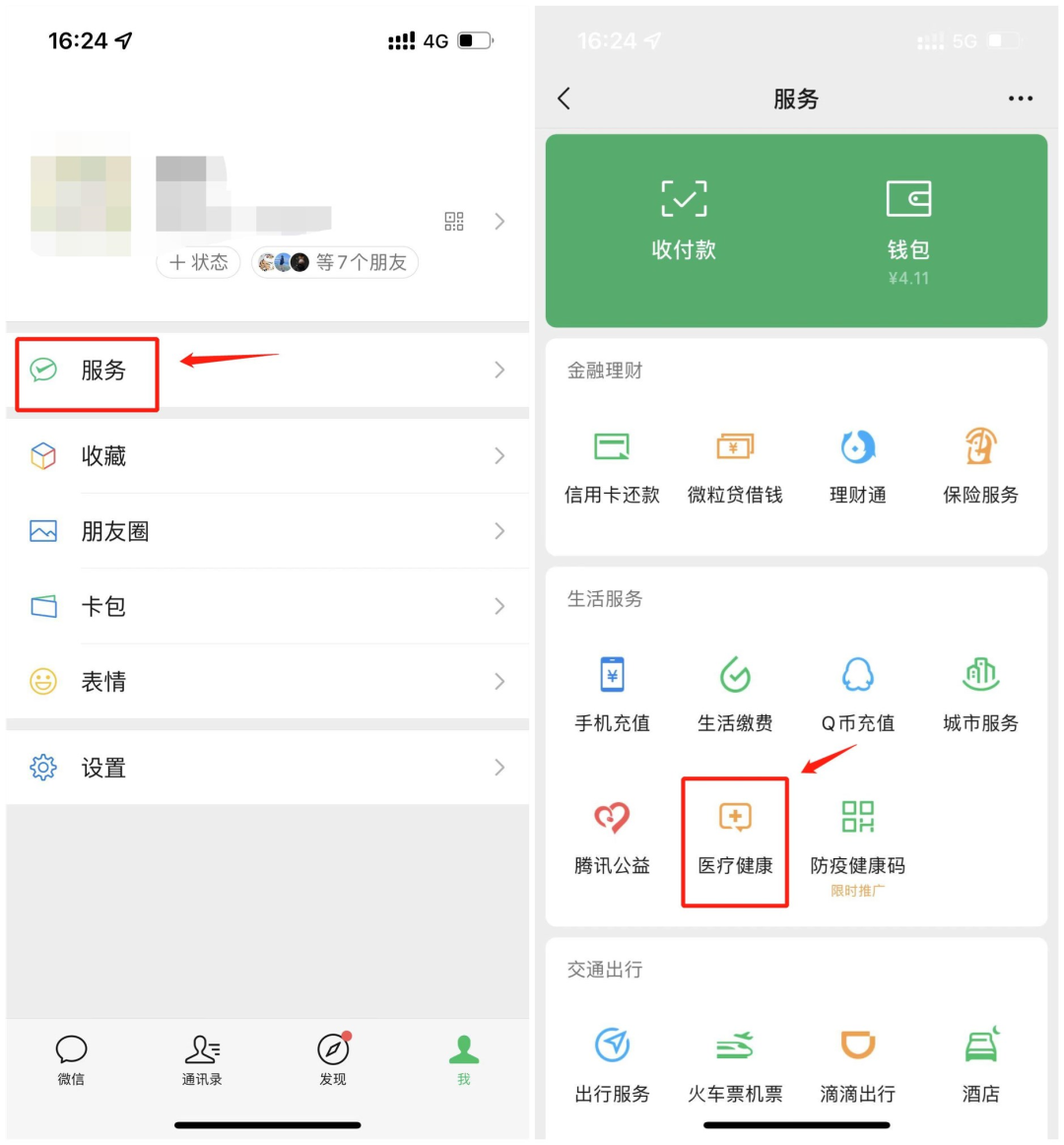 设置方法非常简单,打开【微信】-【我的】-【服务】,找到【医疗健康】。