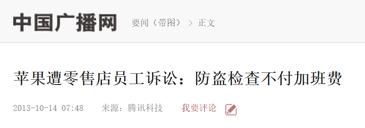 苹果的一项“搜包政策”(personal package and bag search policy)要求苹果零售店员工每一次在离开工作岗位的时候(比如午休、下班)都要排队5—15分钟的时间等候被搜包。