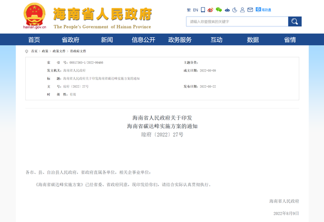 根据海南省人民政府印发的《海南省碳达峰实施方案》: