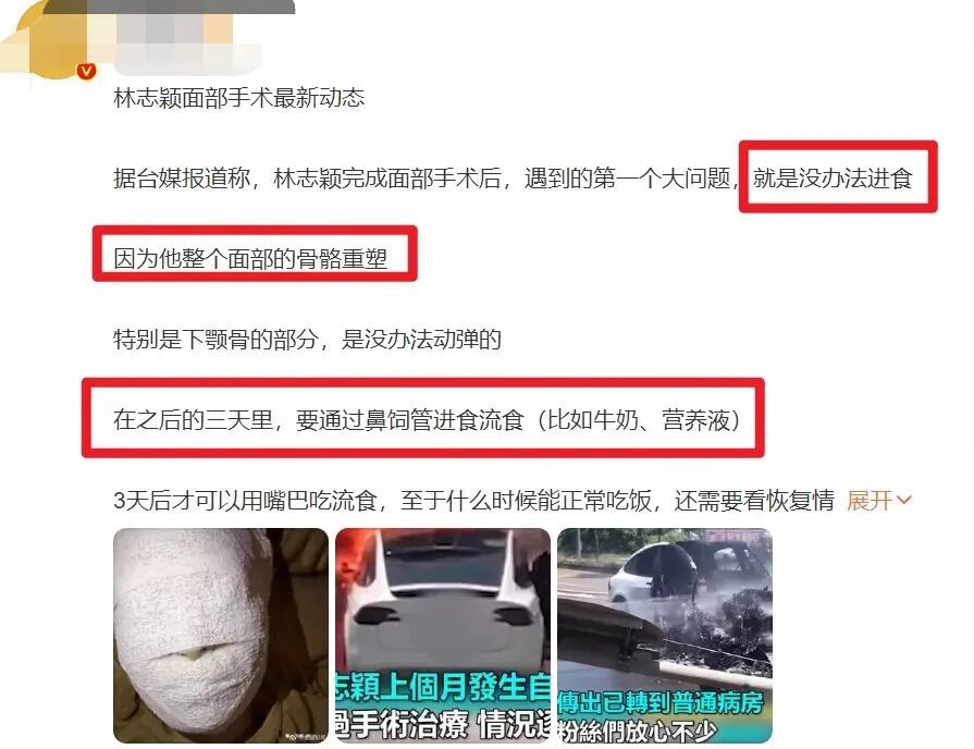 当时爆料称林志颖因整个面部骨骼都重塑过了,尤其是下颚骨部分不能动弹,所以无法进食。