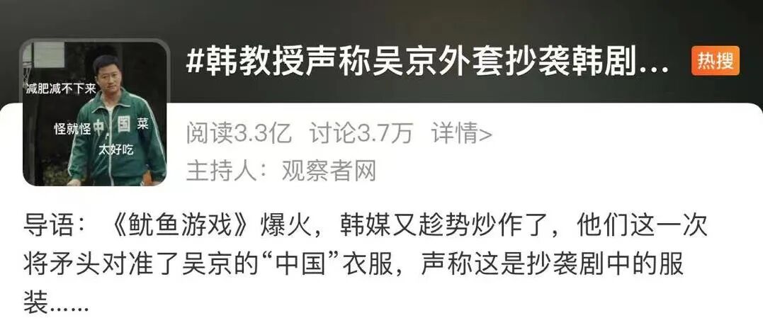 一位韩国教授声称吴京同款外套涉嫌抄袭《鱿鱼游戏》,还登上微博的热搜榜。