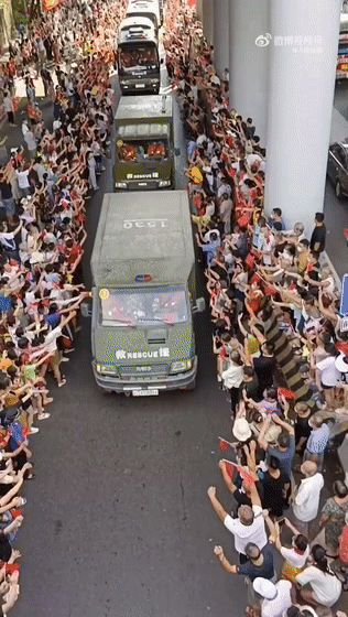 昨天上午,云南省森林消防总队增援重庆山火最后一批队伍304名指战员从重庆撤离,市民在街头夹道欢送。