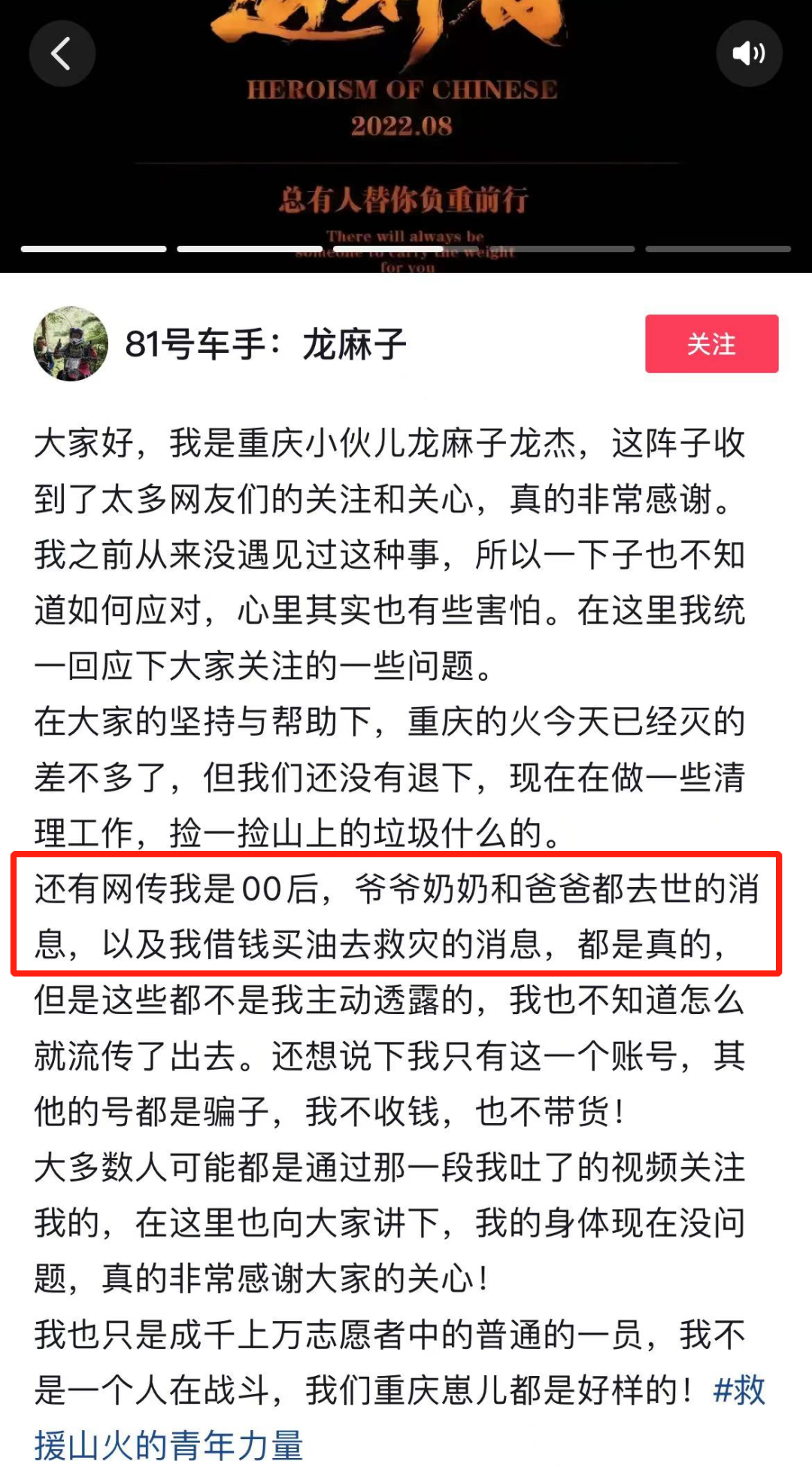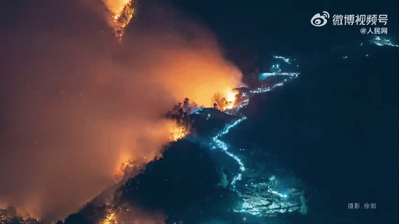 “那里本没有路,是无数志愿者的脚步;那路本没有灯,是无数志愿者的头灯照亮了重庆儿女用身躯铸造的防火长城。”