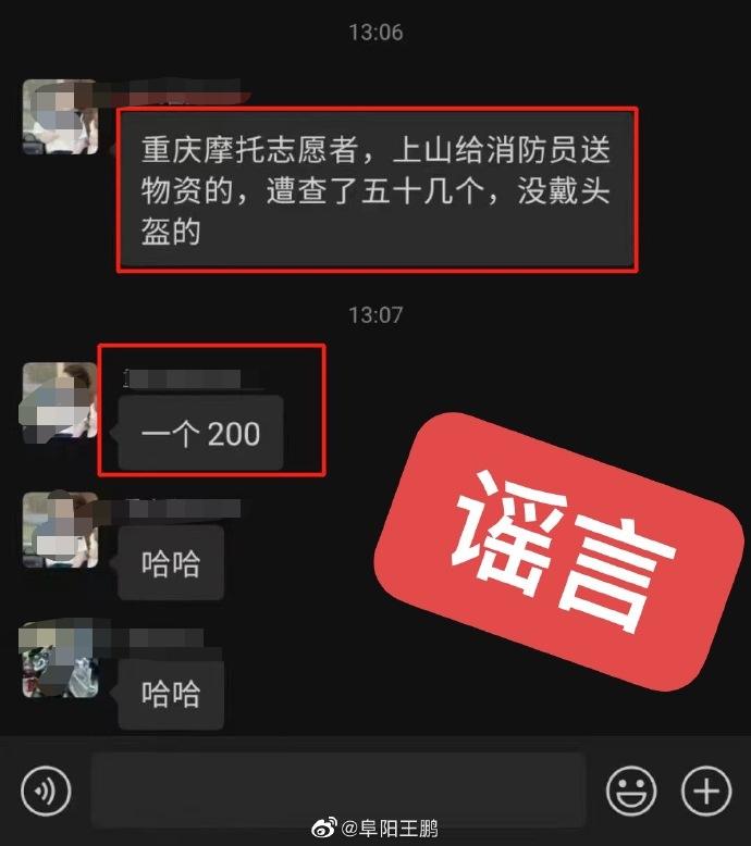 8月25日,有聊天截图显示“重庆摩托志愿者上山给消防员送物资因未戴头盔而被璧山交警罚款”,“一个200块”,引发网络关注。