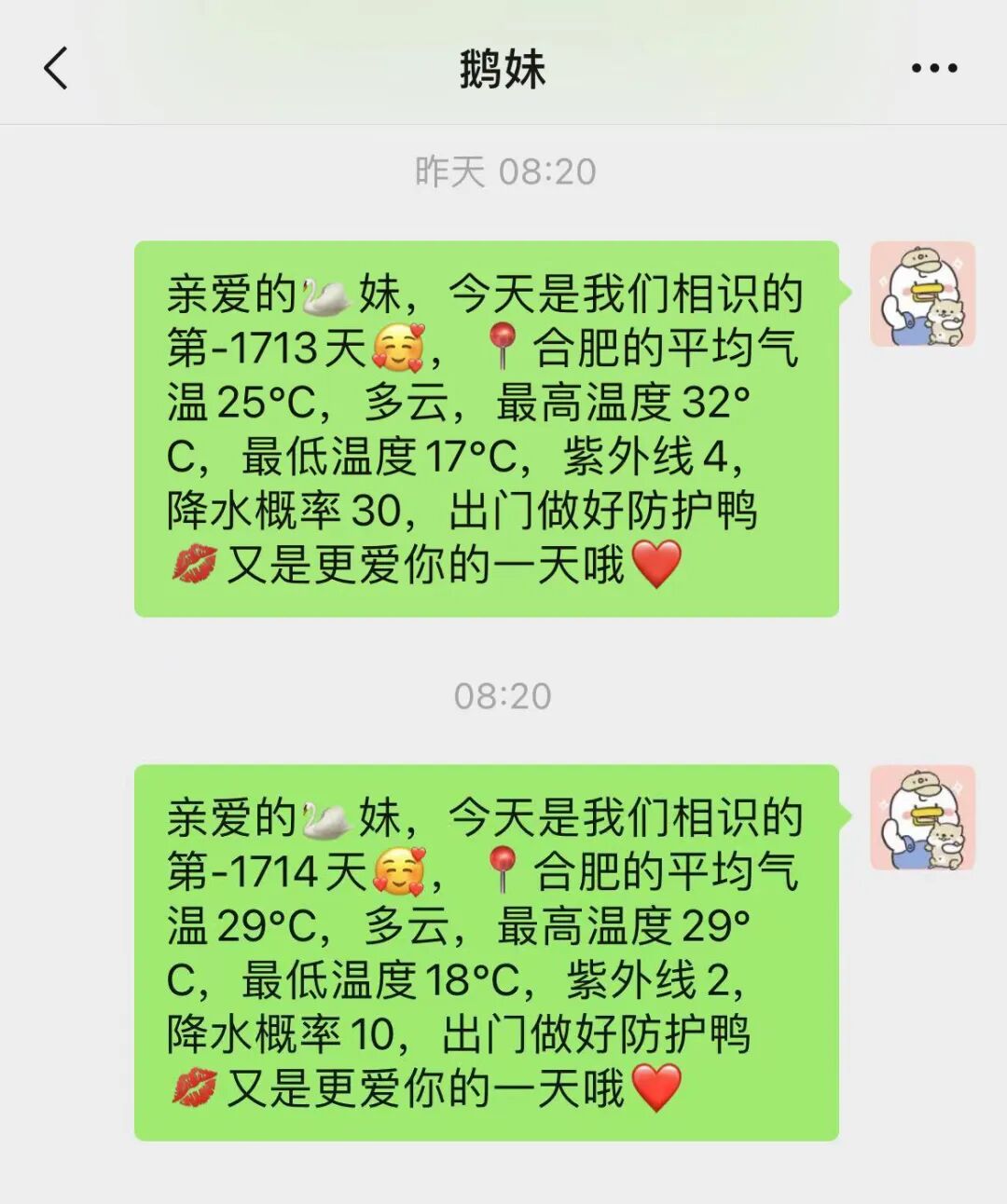 亲爱的🦢妹,今天是我们相识的第-1714天🥰,📍合肥的平均气温29°C,多云,最高温度29°C,最低温度18°C,紫外线2,降水概率10,出门做好防护鸭又是更爱你的一天哦