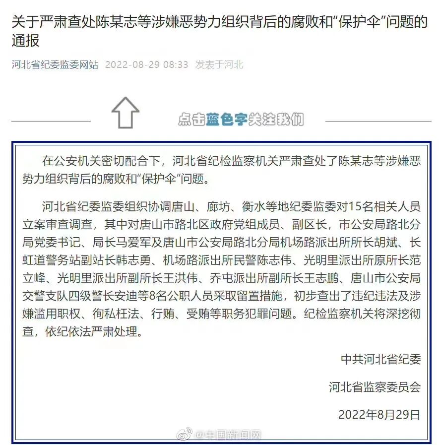 除了对陈某志等人的调查之外,河北省纪检监察机关同样严肃查处了其恶势力组织背后的腐败和“保护伞”问题。