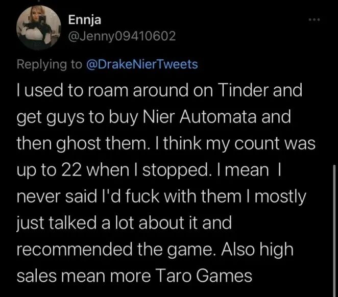 据她自己统计,差不多有22名接近她的男生为此购买了《尼尔:机械纪元》。