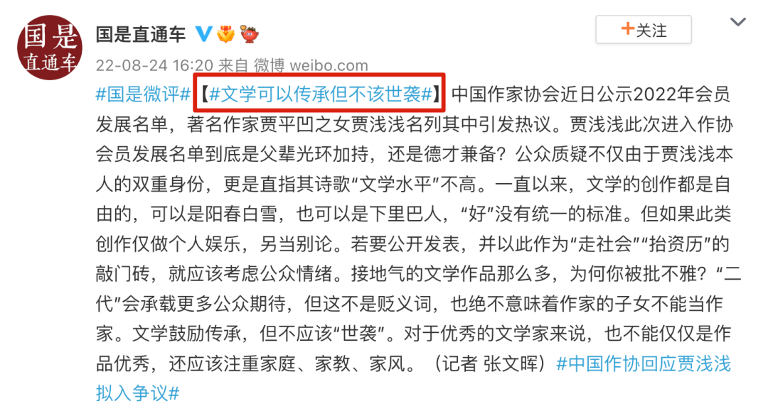 与此同时,央媒也评论称:文学可以传承但不该世袭。