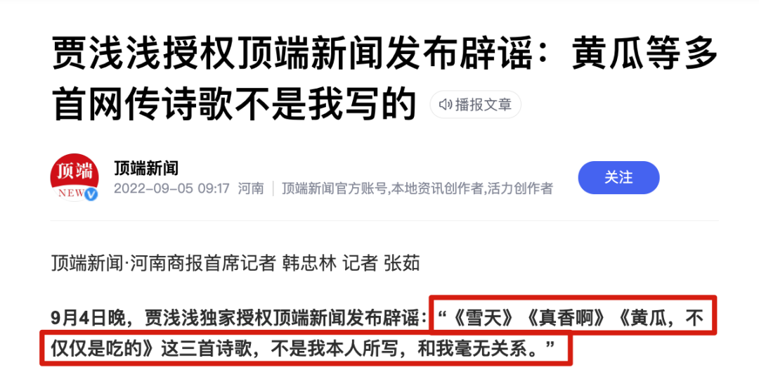 而另一头,贾浅浅也辟谣称,《雪天》、《真香啊》、《黄瓜,不仅仅是吃的》三首诗歌“不是我本人所写,和我毫无关系”。