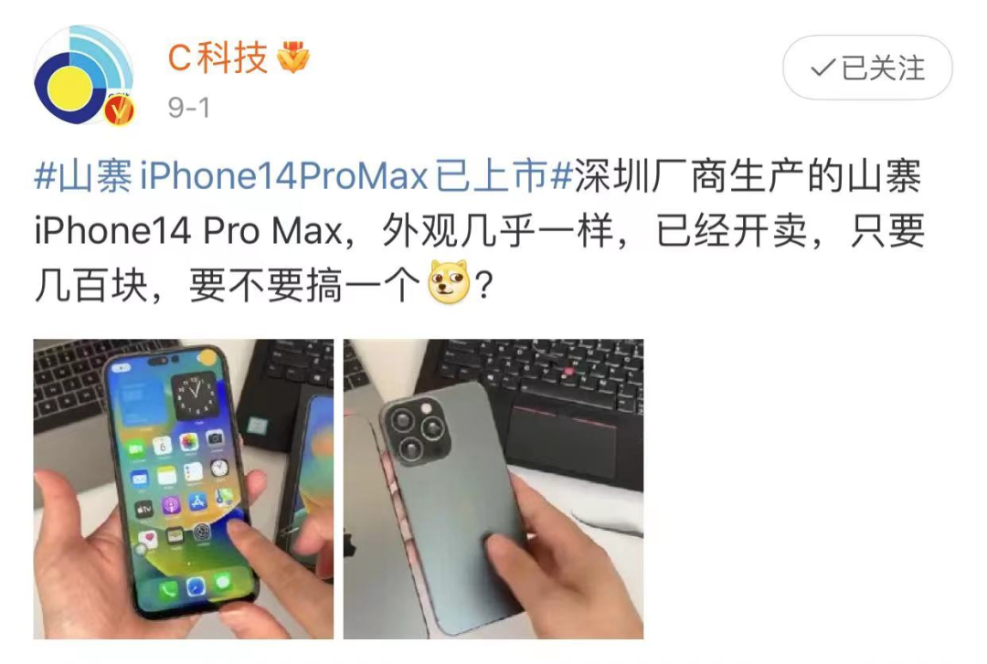 当然,有市场就有人会想歪点子,苹果这边还没卖,部分寨厂的“iPhone 14”机器就已经早早上架了,价格还只有几百块钱……
