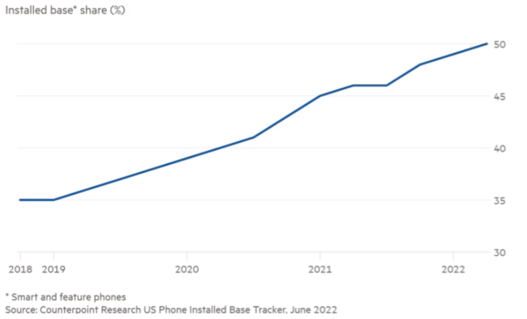 据Sammobile最新报道,行业分析机构Counterpoint Research的报告显示,苹果iPhone在美国的市场占有率已突破50%,剩下的部分则由包括三星Galaxy系列在内的大约150款安卓设备所占据。