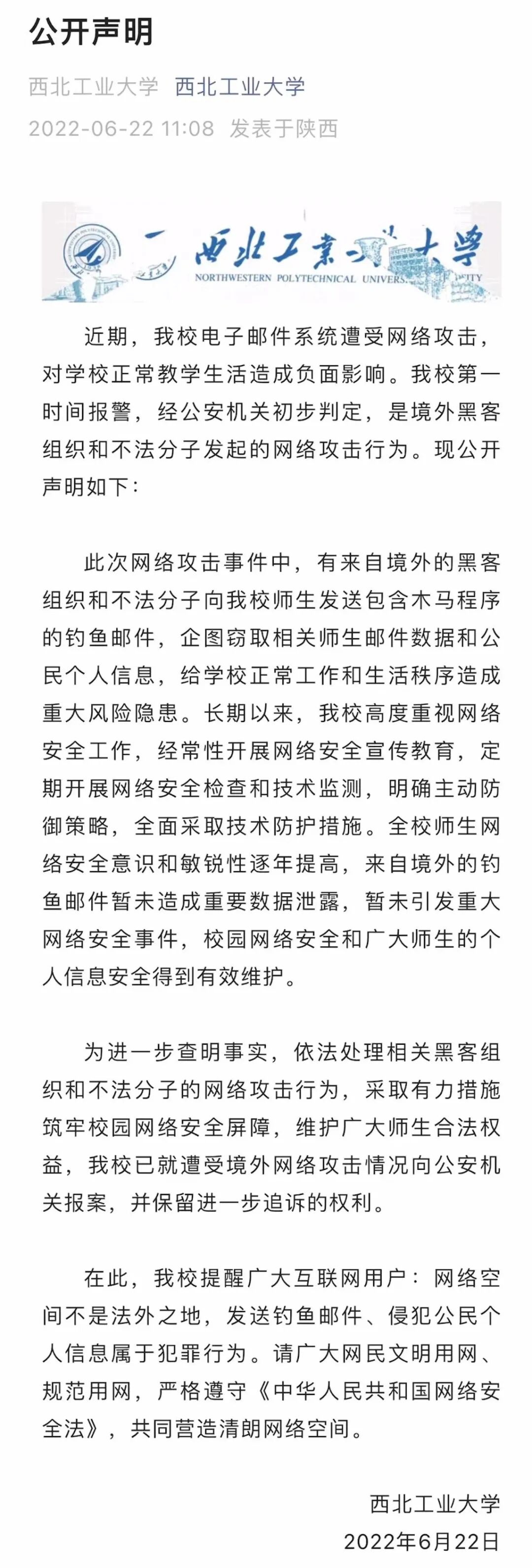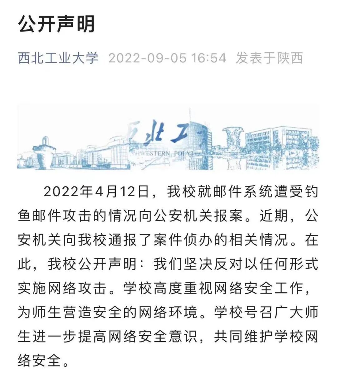 今年6月,西北工业大学曾公开表示邮件系统遭受网络攻击,有来自境外的黑客组织和不法分子向该校师生发送包含木马程序的钓鱼邮件,企图窃取相关师生邮件数据和公民个人信息。