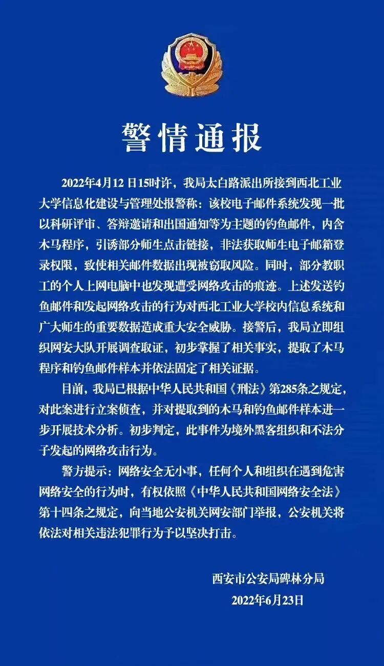 随后,公安机关发布《警情通报》称,初步判定,此事件为境外黑客组织和不法分子发起的网络攻击行为。
