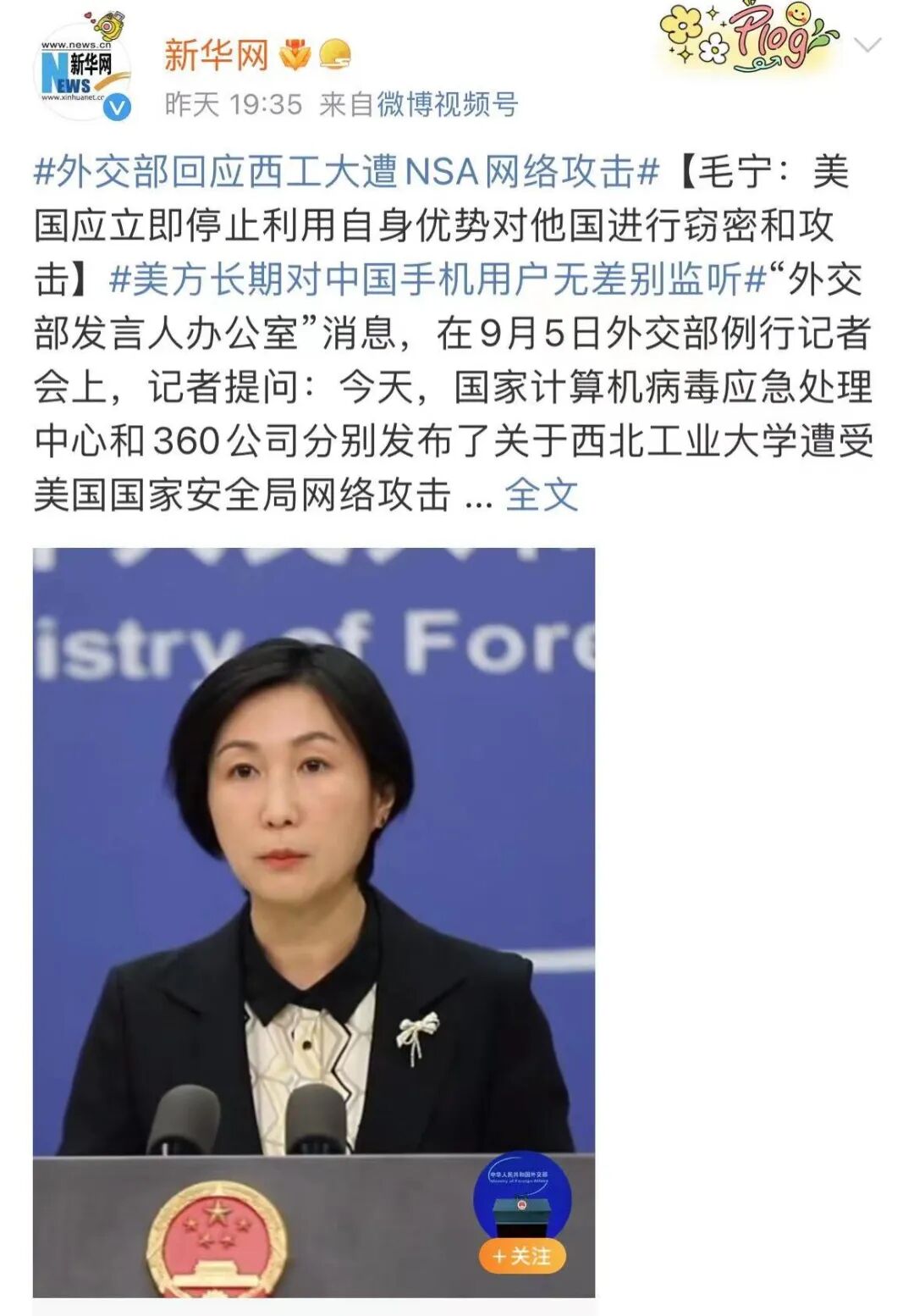 对于西北工业大学遭到美国国家安全局网络攻击一事,外交部新任发言人毛宁表示,“美方行径严重危害中国国家安全和公民个人信息安全。中方强烈谴责,要求美方作出解释并立即停止不法行为。”