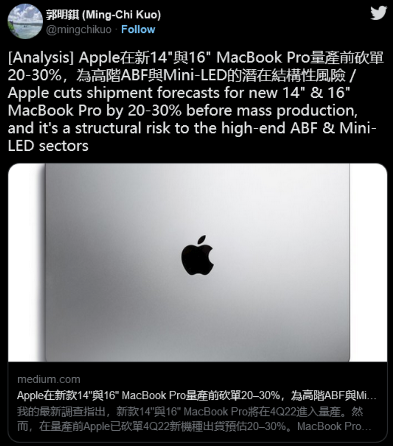 业界大佬、天风证券分析师郭明錤前几天才发帖称,苹果已将新款MacBook Pro订单砍掉了20%-30%。