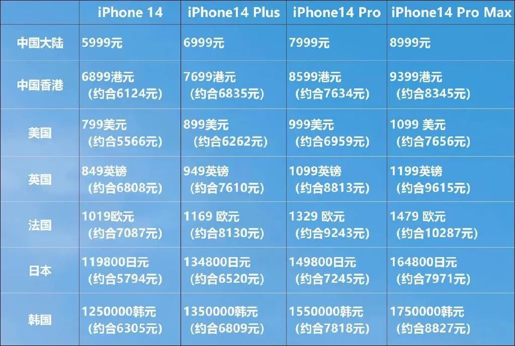 根据@红星资本局 汇总的新品售价,美国iPhone 14系列最便宜,欧洲地区售价整体偏高。美版iPhone 14 Pro Max起售价比国行版便宜1343元。