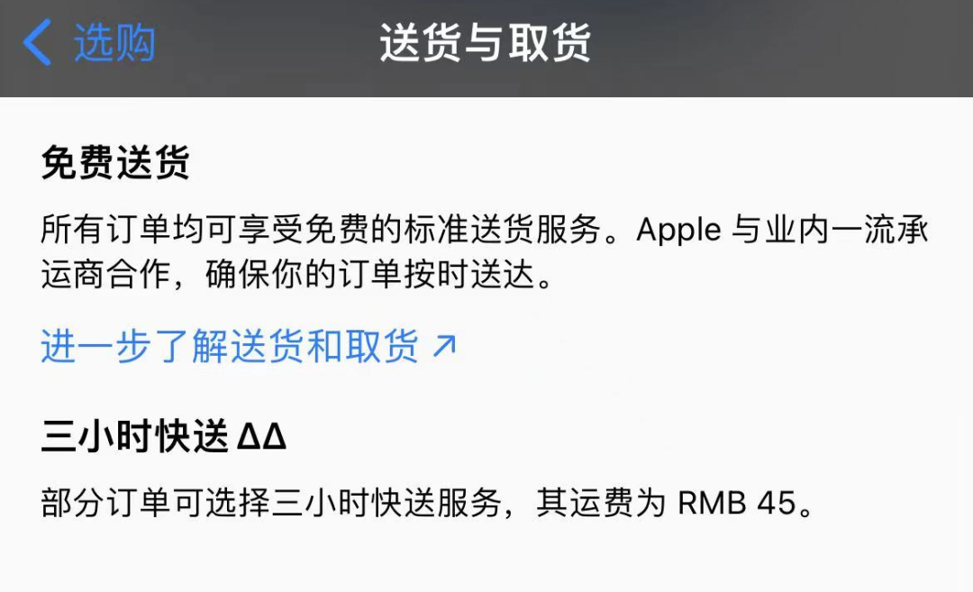 配送方式,可以选择免费送货(部分订单3小时就可以送达,需要额外付运费45元)或者到店取货。如果你所在的城市有Apple Store零售店的话,选择到店取货能更早拿到新机。