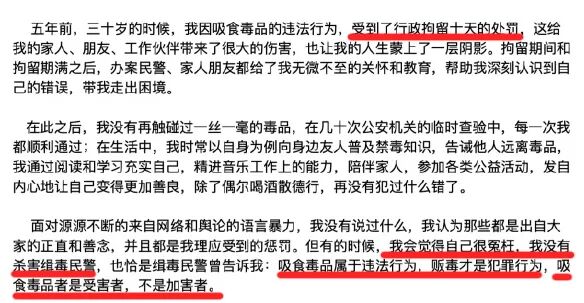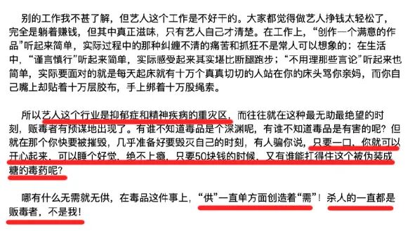 第三部分:当艺人好惨,很多人抑郁了,我吸毒全怪毒贩子勾引我,毒贩子说“只要一口就能开心起来”,“只要50块钱”,我拒绝不了“这个被伪装成糖的毒药”(额,这话听着怎么像给毒品做宣传呢)。