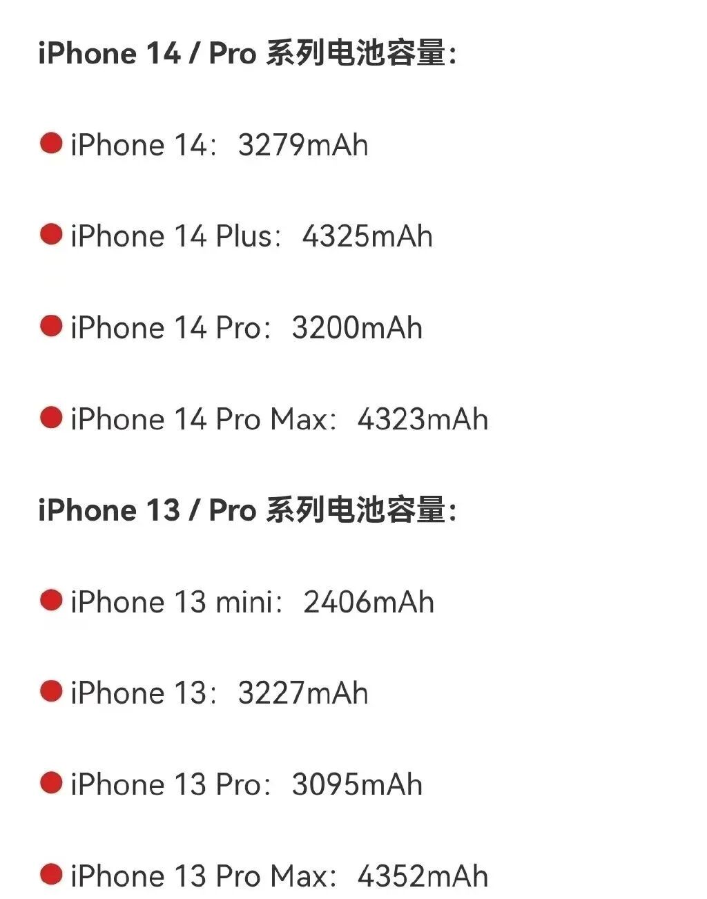 在新品发布会上,苹果并没有公布iPhone 14系列的电池容量,但最近MacRumors发现,监管数据库显示,iPhone 14、iPhone 14 Plus、iPhone 14 Pro三款机型的电池容量相比上一代都有所提升,但iPhone 14 Pro Max电池容量反而下降了。