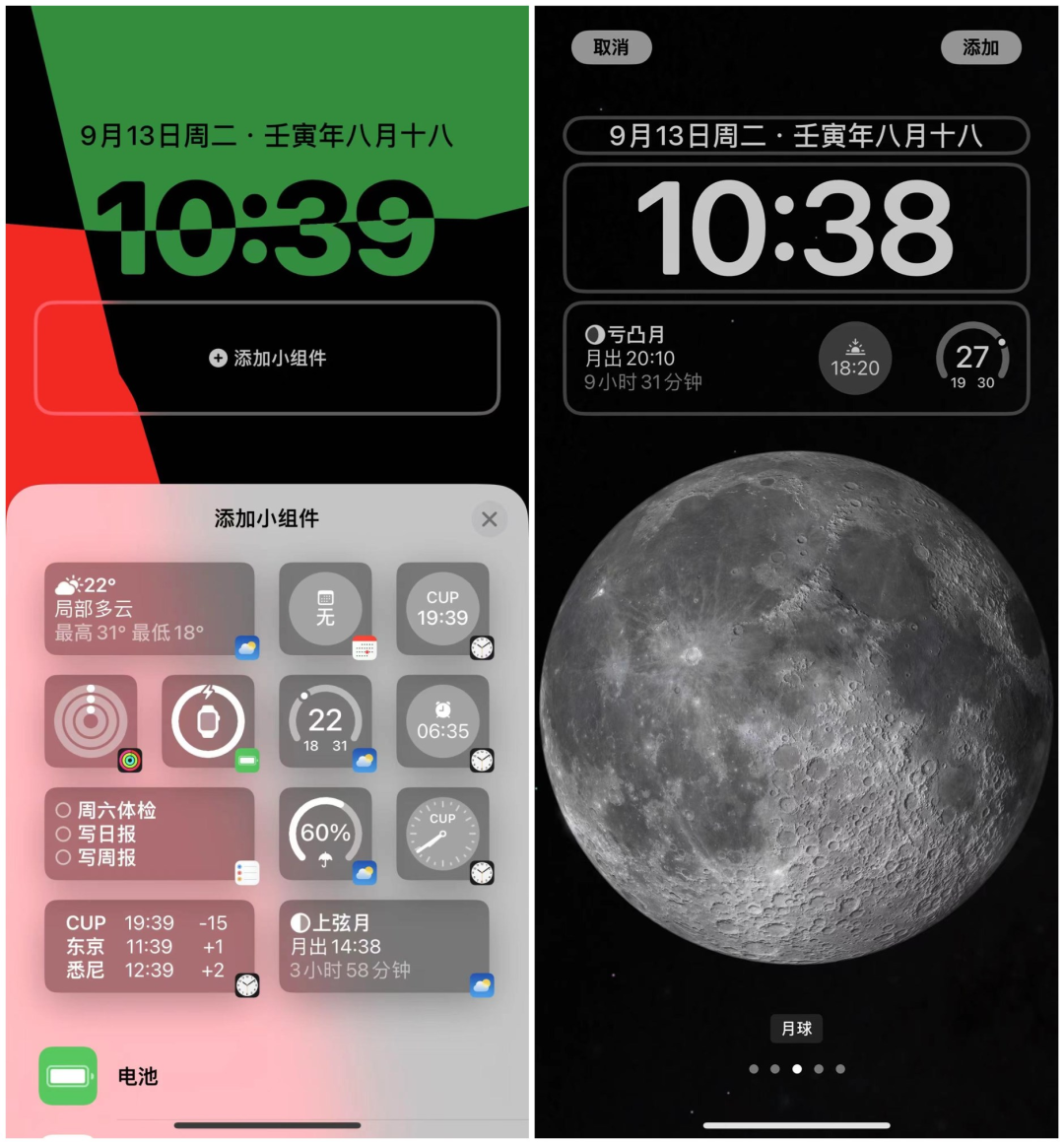 iOS 16最直观的变化就是新增支持自定义锁屏桌面,可以各种排列组合,有点像Apple Watch。