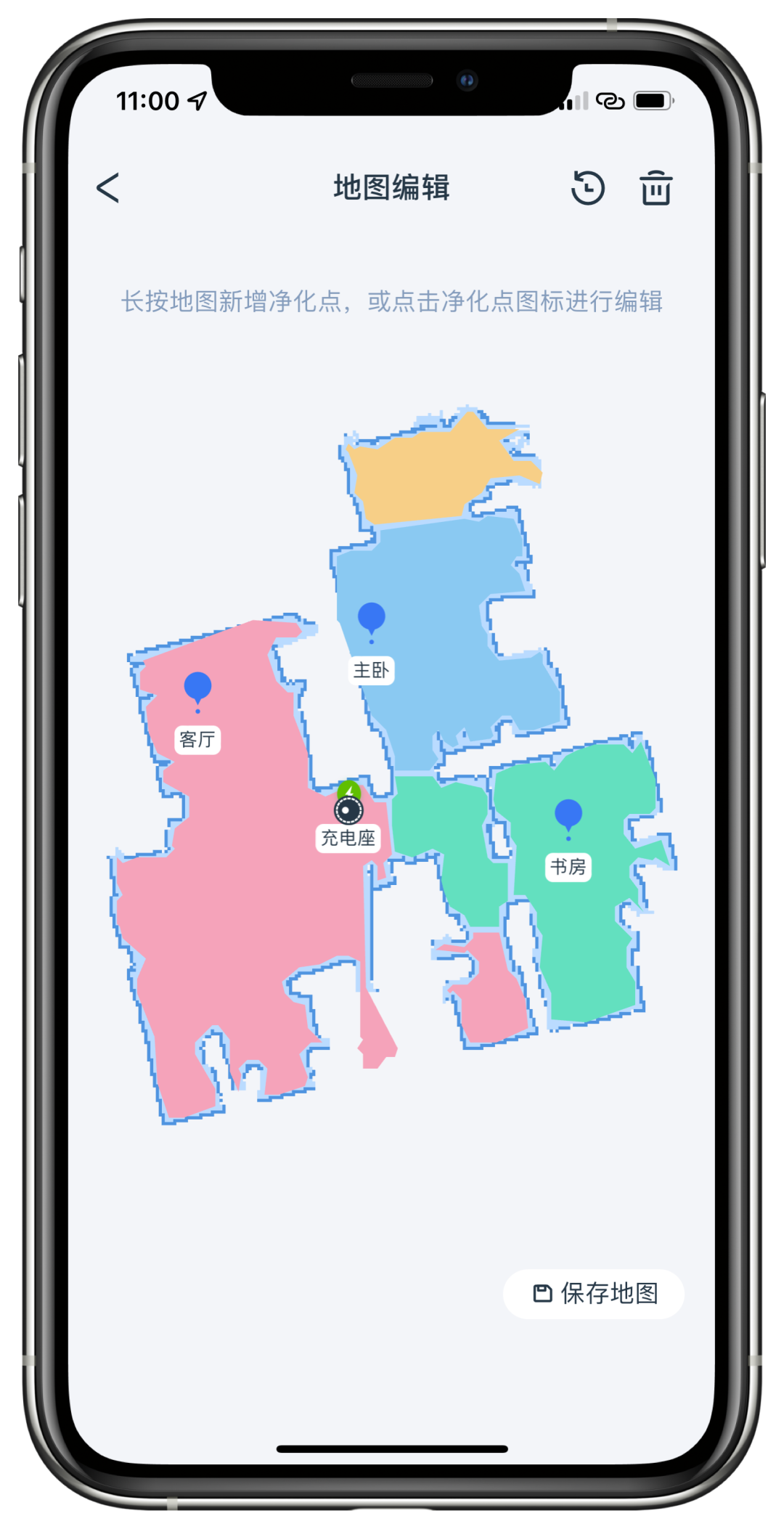 鸭鸭实测,100平的屋子只花了5分半便完成了建图。值得一提的是,沁宝AVA PRO在快速建图后,还对不同房间进行了智能分区。