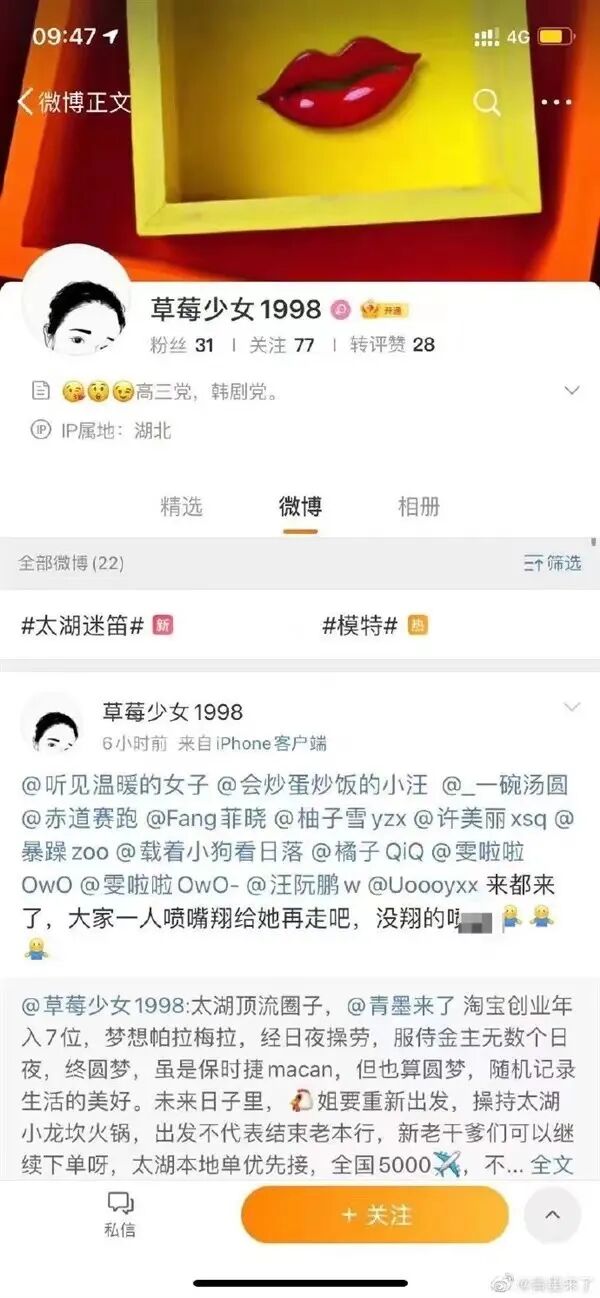 还有一个叫“草莓少女1998”的账号,污蔑女博主“日夜操劳,服侍金主无数个日夜”。