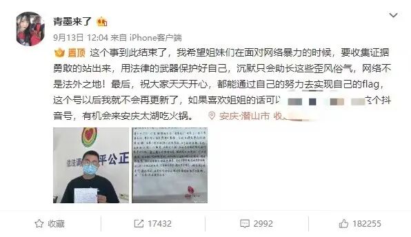 小姐姐表示,这件事到此结束了,自己的账号以后也不会再更新了。同时“希望姐妹们在面对网络暴力的时候,要收集证据勇敢的站出来,用法律的武器保护好自己,沉默只会助长这些歪风俗气,网络不是法外之地!”