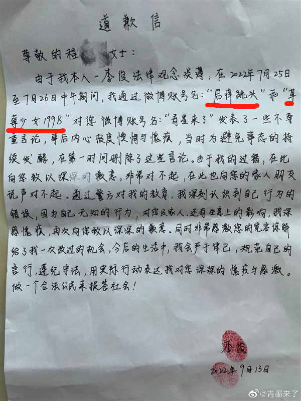 最近,这件事的处理结果来了!键盘侠已经于9月13日手写了道歉信。