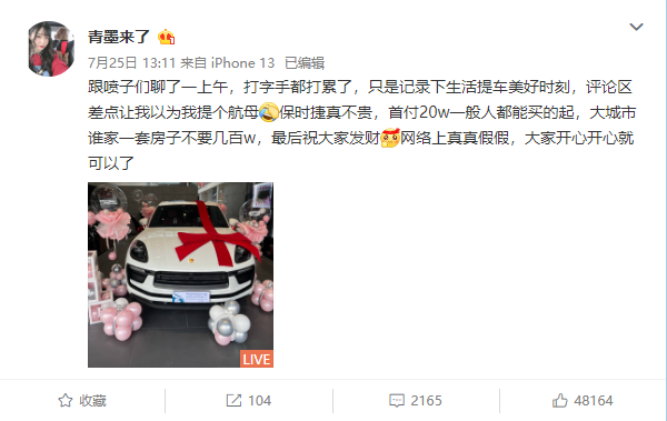结果一大波键盘侠破防了,纷纷质疑她买保时捷的钱从何而来。