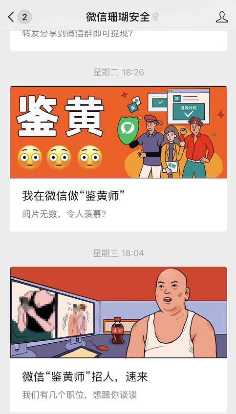 就这两天,微信官方内容安全帐号【微信珊瑚安全】接连发了两篇有关“鉴黄师”工作介绍以及招聘信息的文章,看得我那叫一个热血沸腾