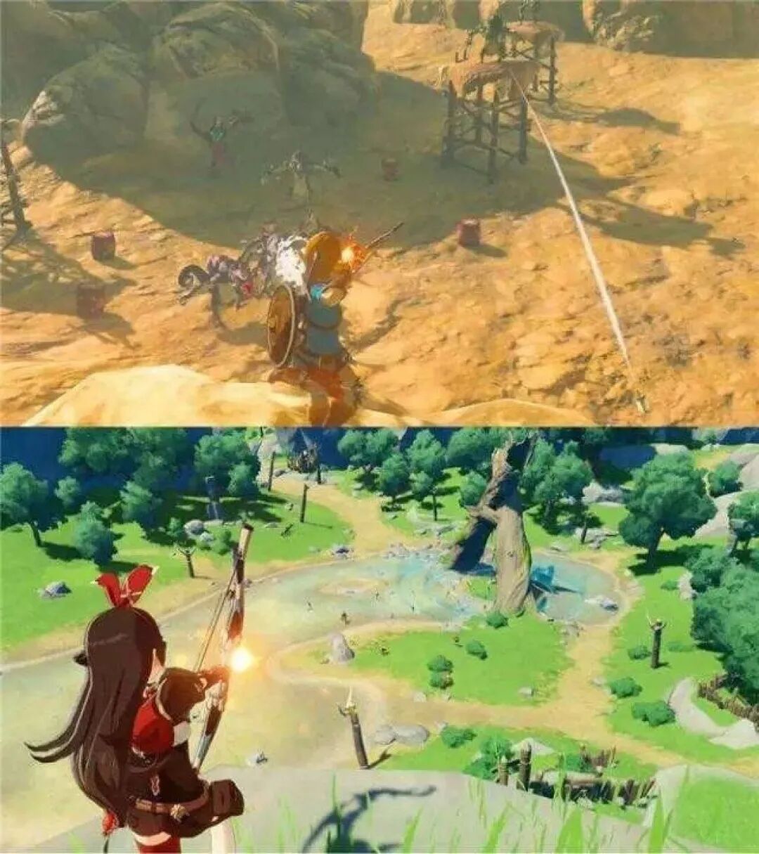 相关《原神》“致敬”《塞尔达传说:荒野之息》的例子,光是当年的预告片,网友随随便便都能举出一大堆,这个争议点也一直持续到现在。