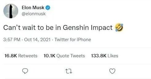 对此,10月14日,埃隆·马斯克(Elon Musk)本人亲自在推特上回应,称自己“已经迫不及待地想进入《原神》的世界了”。