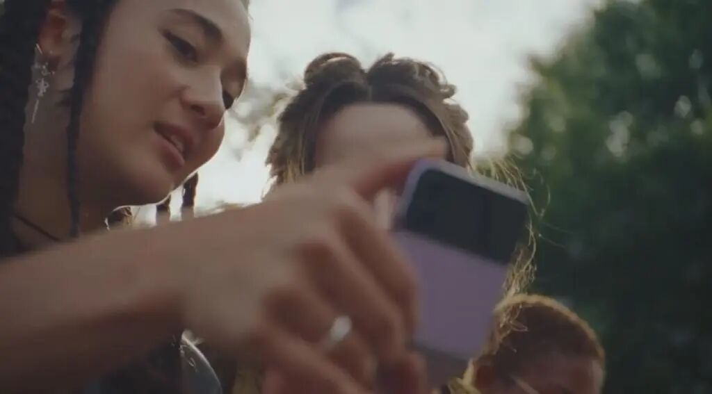 在视频中,一位三星用户向旁边的苹果用户展示了三星 Galaxy Z Flip 4 的可折叠设计。