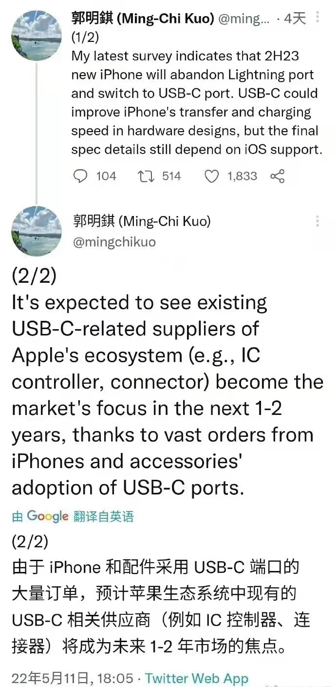 苹果可能会从2023年开始,将iPhone(iPhone 15这一代机型)的Lightning接口改为USB-C接口;AirPods、Magic Keyboard等产品也将改用USB-C接口。