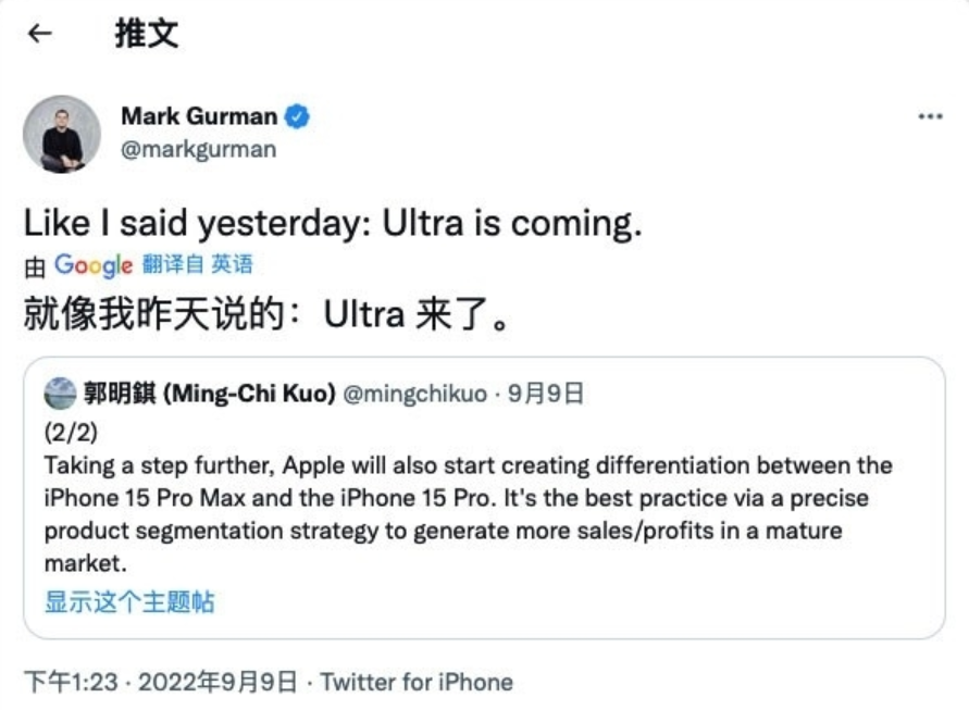 综合大神郭明錤和诸多外网博主的消息,苹果或将抛弃现有顶配版本上“Max”的命名方式,而是直接换成和目前诸多安卓旗舰机常用的“Ultra”命名。
