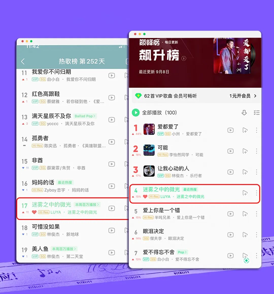 而在最近的热歌榜单上,同样也出现了一首虚拟歌手演唱的歌曲——《迷雾之中的微光》,赫然与Eason和JJ等大咖同框。